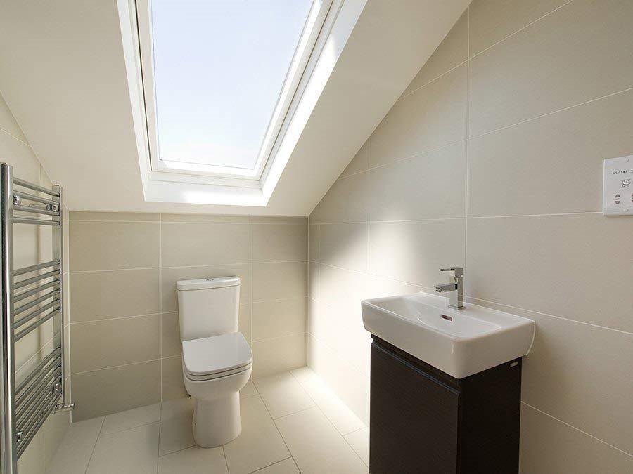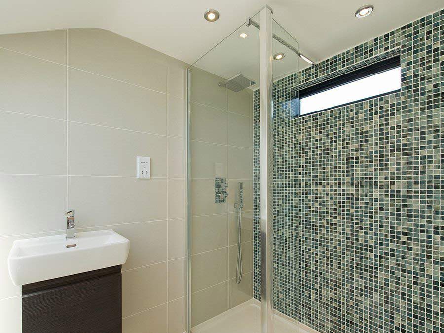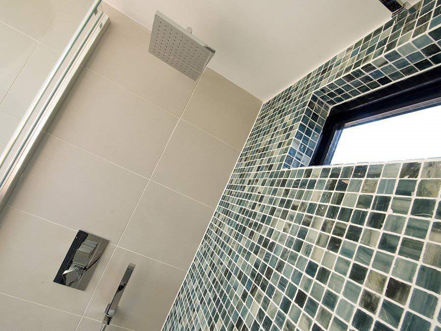 The ensuite shower room is fresh and modern with its mosaic feature wall and custom crafted slimline window above the walk-in shower. Another Velux roof light further brightens the space.