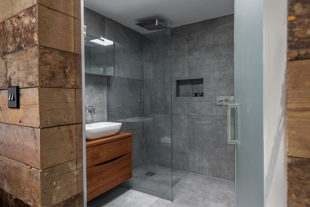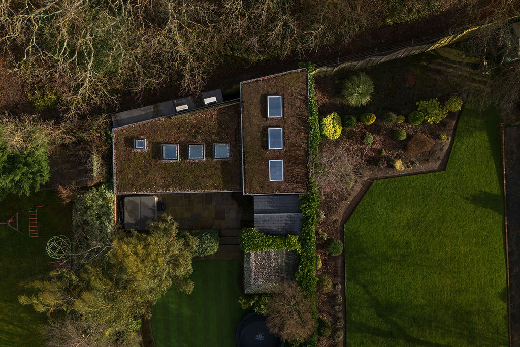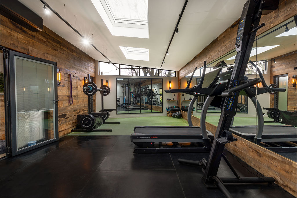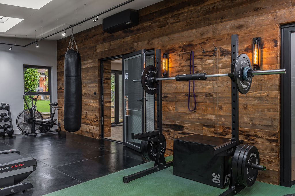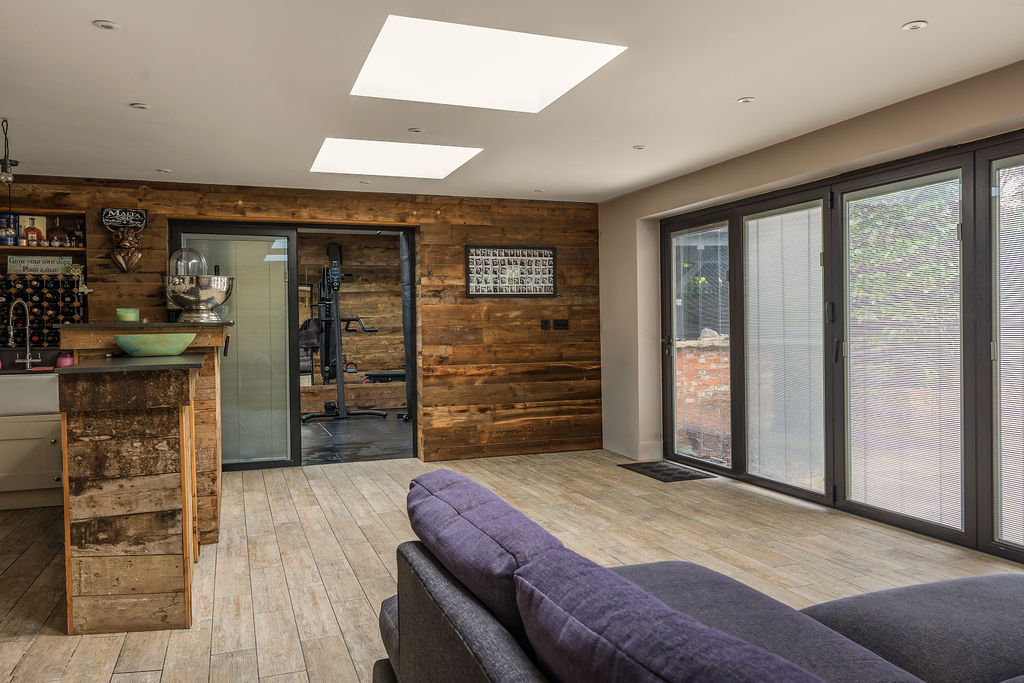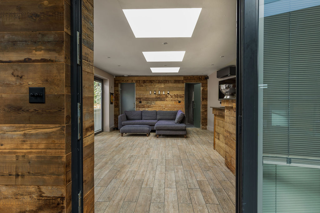 Inside, the open-plan layout features a custom-built bar area, lounge space and a fully equipped home gym, finished with warm reclaimed timber wall cladding for a distinctive, modern-industrial feel. Large rooflights and glazed doors allow natural light to flood the space while maintaining a strong connection with the garden.