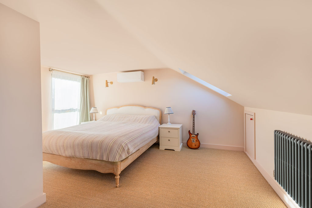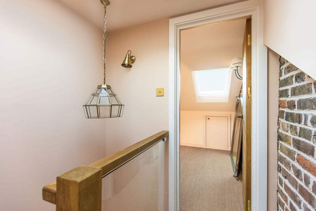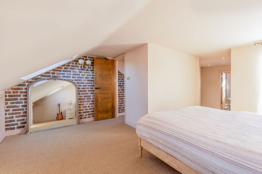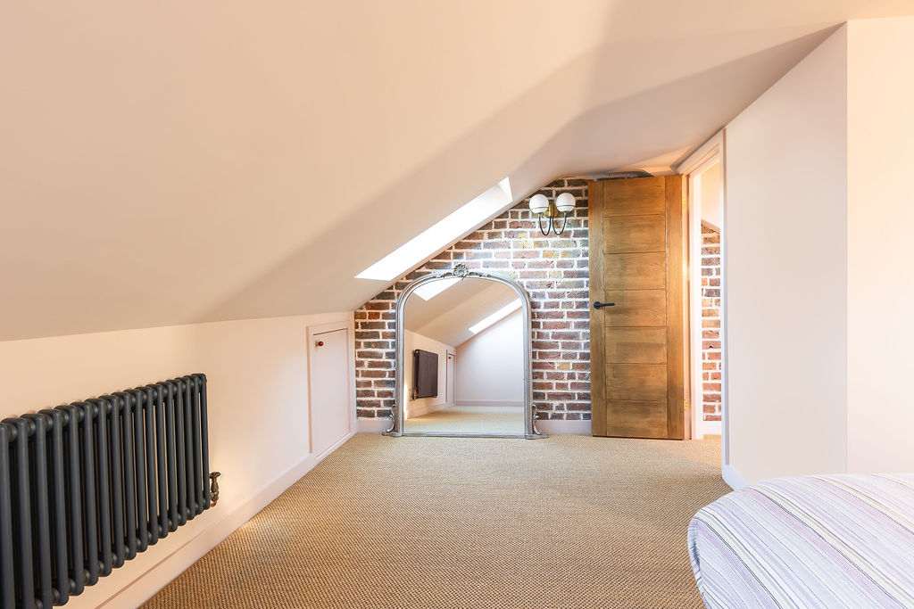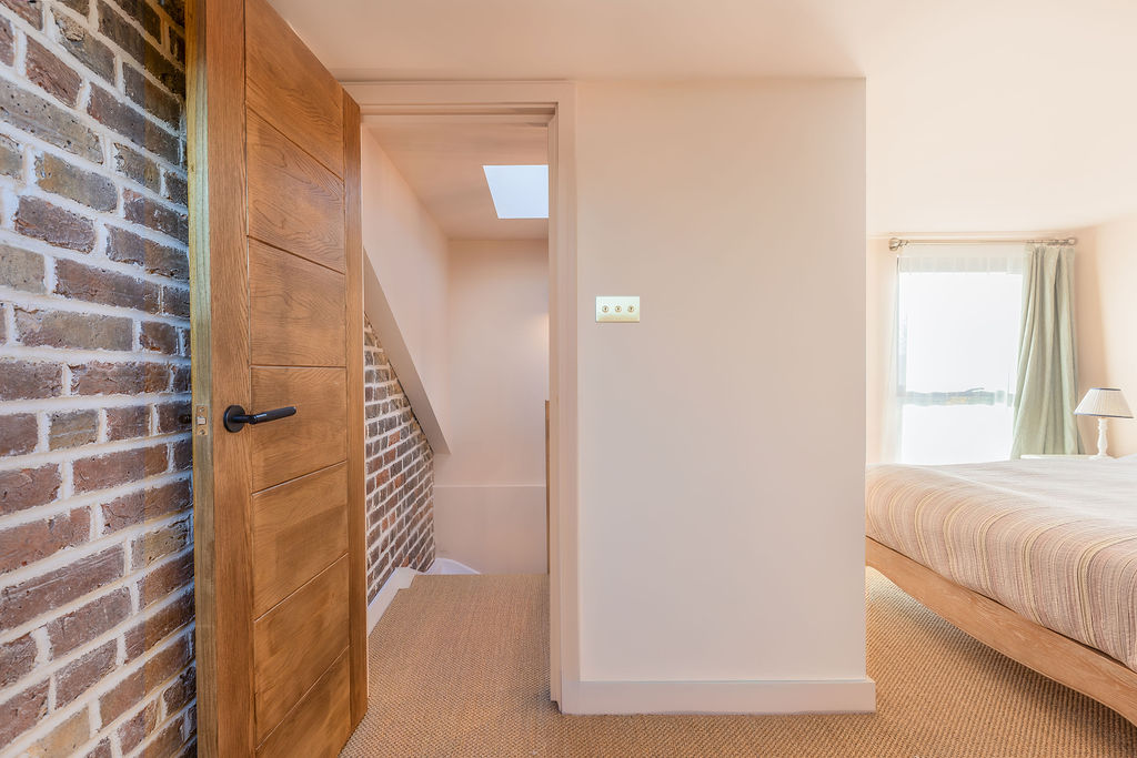 The room features large rooflights that flood the space with natural light, while the sloping ceilings have been cleverly utilised with built-in eaves storage. Exposed brickwork and warm natural finishes add character, while the soft neutral colour palette enhances the feeling of space.