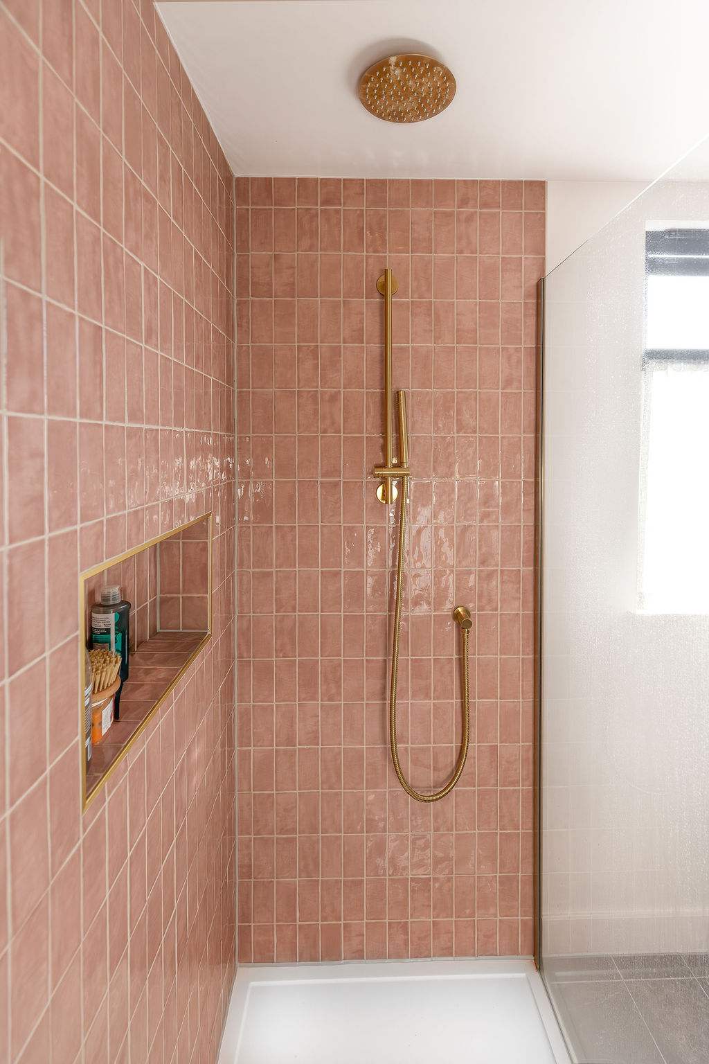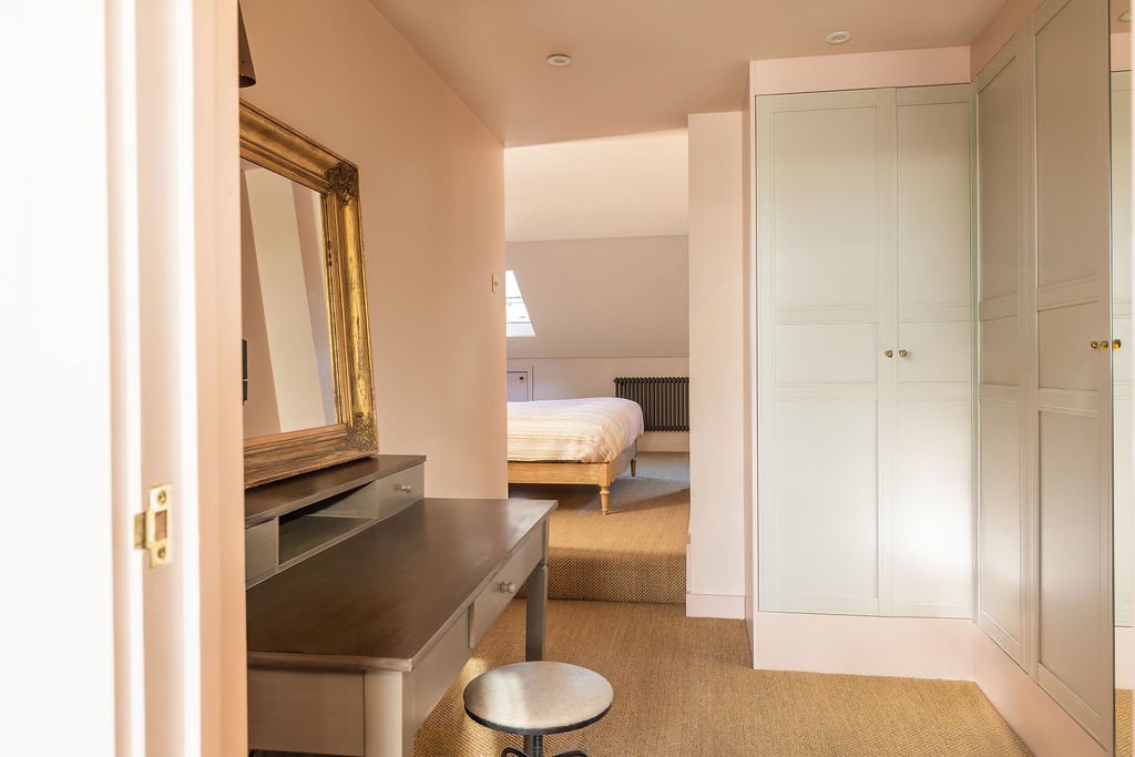 A beautifully designed en-suite bathroom completes the conversion, featuring blush-toned tiles, brass fixtures and a walk-in shower for a modern, high-end finish.
